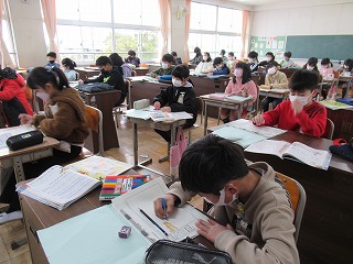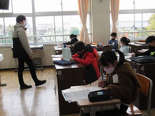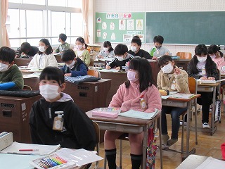 3年2組が音楽を行っていました。楽器を想像し、考えていました。みんな思いをふくらませ、プリントに記入していました。