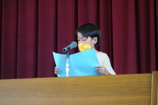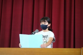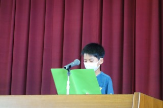 児童代表スピーチは、2年生、4年生、5年生の代表が話しました。体育館の舞台の上で、全校児童の前で堂々と話をすることができました。