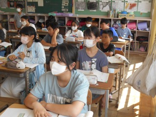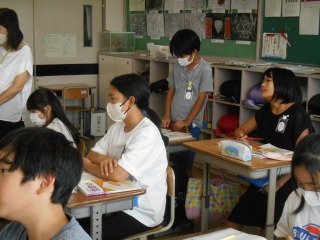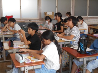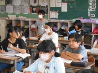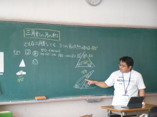 三角形の内角の和の性質を使い、角度を求めるためにどのような順序で考えるとよいか、代表の子が説明をしていました。
