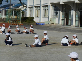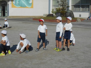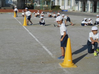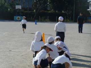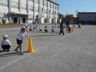 コーンからコーンの30mほどの距離を往復していました。「いちについて、ようい、どん」の姿勢も確認しながら楽しんでいました。待っている子の応援もばっちりでした。