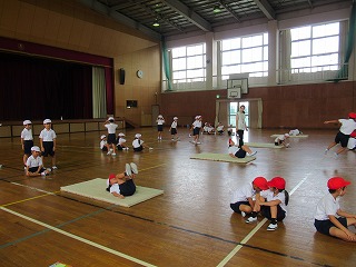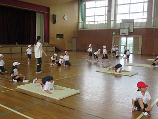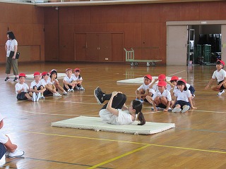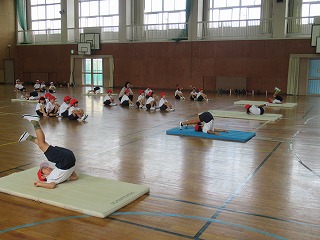 1年生は、体育館でマット運動を行っていました。後ろに回って足をマットに付ける運動にチャレンジしていました。