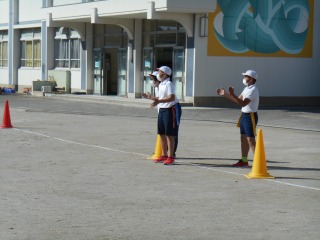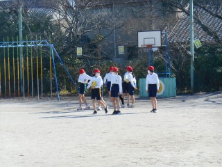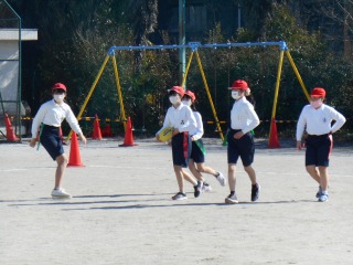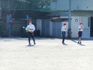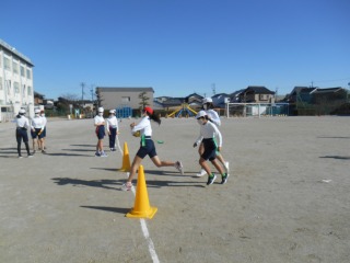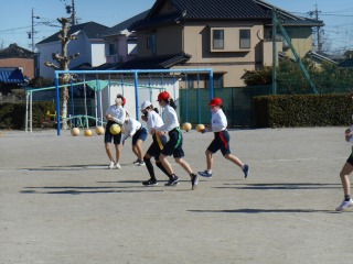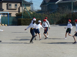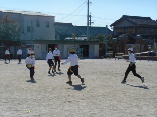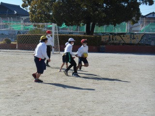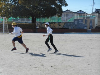 タグラグビーを行っていました。笑顔いっぱいで、ボールを持って走ったり、仲間にパスしたり。楽しんでいました。