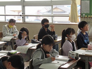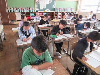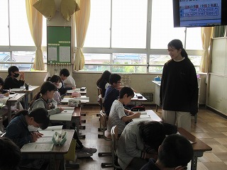4年2組は算数の時間でした。大きな数の問題を解いていました。早く解けた児童は、自信にあふれる姿勢で待っているのが印象的でした。