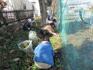 本日も6名の方にご参加いただき、運動場南側のフェンス外の除草作業を行わせていただきました。寒い中でしたが、授業で運動場を走り回る4年生や1年生の姿を見ながら、和気あいあいと作業させていただきました。活動後には、大谷翔平選手から寄贈されたグローブを見たり、写真を撮ったりする時間もありました。