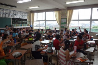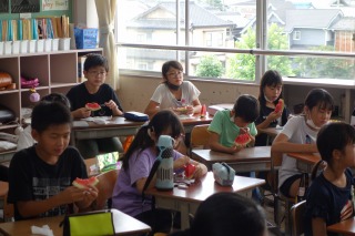 5年生の畑でスイカがとれました。1、2組みんなで、育てたスイカの味見をしました。