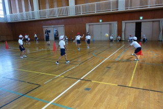 3年1組の体育は、体育館でボール運動を行いました。輪になって距離をとり、ボールをパスしました。