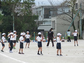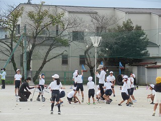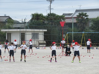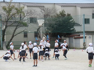 2年生が、音楽に合わせ、チェッコリをおどり、その後、玉入れをします。おしりを振って、なんともかわいい様子が、見えているこちらを笑顔にしてくれます。