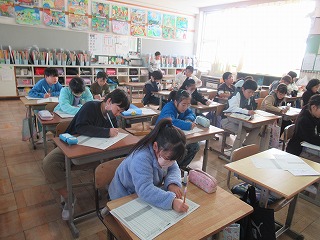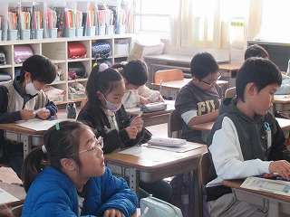 3年1組は、学活の時間でした。リコーダーカードに演奏する曲のタイトルを書きこんでいました。
