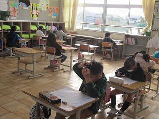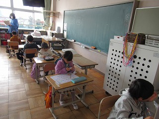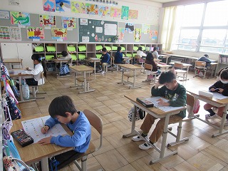 1年1組はテストに取り組んでいました。難しい問題があるのか、頭を抱えながら取り組んでいる子もいました。見直しまで頑張ってくださいね。
