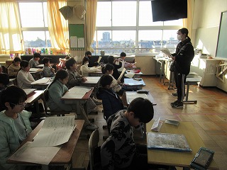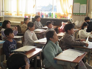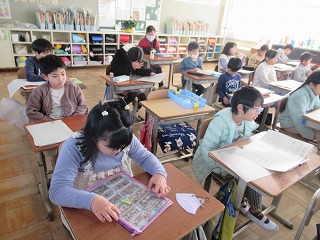 3年2組は学活の時間でした。冬休みの生活について、学年通信を見ながら大切なことを確認していました。