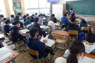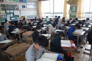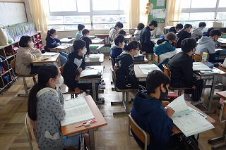 6年2組の学級活動は、楽譜を見ながら卒業に関する曲を聴きました。