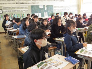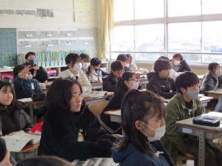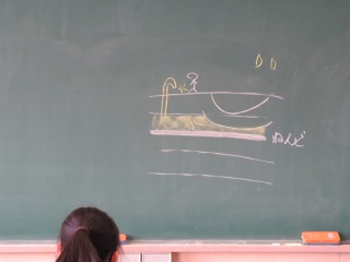 自然と生活のつながりについて学習していました。黒板を使って、地下水を汲みすぎてしまうと地面に何が起こるか考えていました。