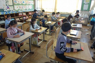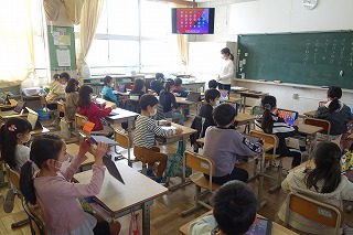 2年1組の学級活動は、タブレット端末の新しい操作を学びました。モニター画面を見ながら操作を確認しました。