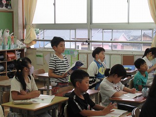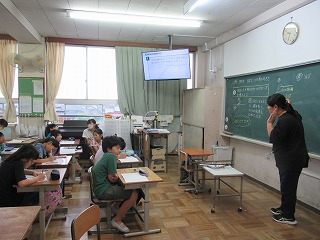 4年1組は算数の時間でした。90度より開いた角度を分度器でどのように測ればいいかを発表していました。