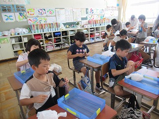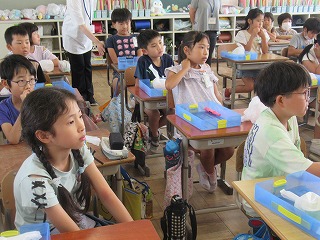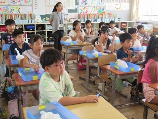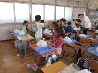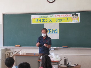 3年2組でも三田先生によるサイエンスショーを行っていただきました。子どもたちは自分で作業をしながら、楽しそうに取り組んでいました。