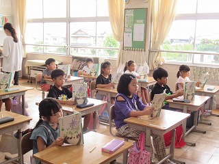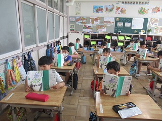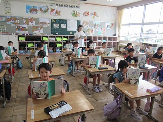 1年2組では、国語の時間、みんなで朗読をしていました。