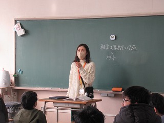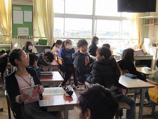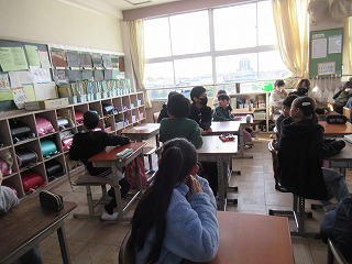 5年2組では、今日一日の予定について、後ろの黒板を見ながら、話を聞いていました。