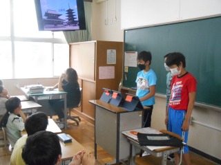 6年生が、五重塔について説明し、クイズを出していました。