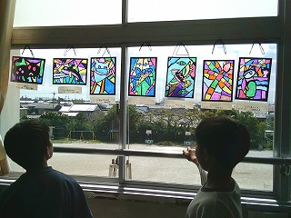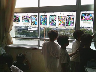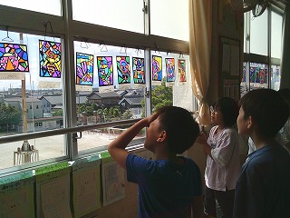 4年2組は図工の時間でした。光の差し込む絵の単元で制作した作品を窓に飾って、友達の作品を鑑賞していました。自分が作った作品に光が差し込み美しく見える様子を見て、子どもたちもとても感動していました。