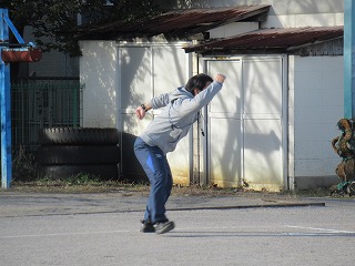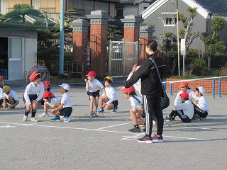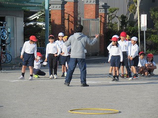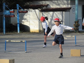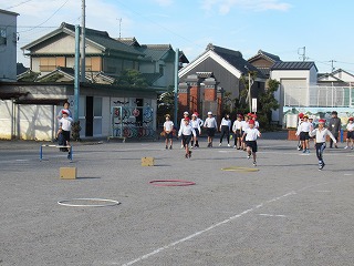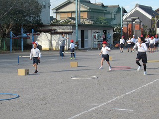 3年2組が運動場で体育の授業を行っていました。工夫されたレーンを一生懸命、走っていました。