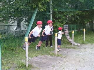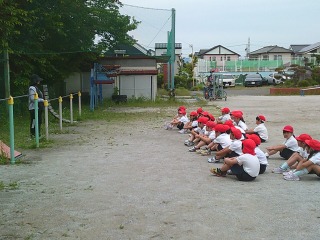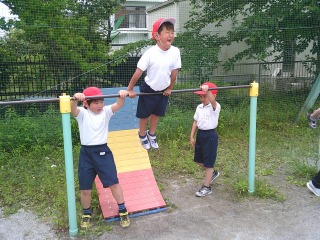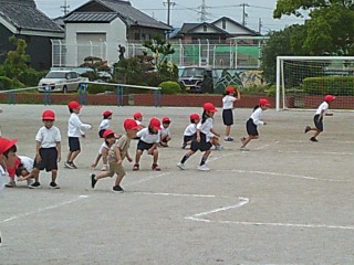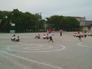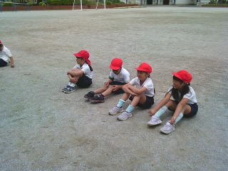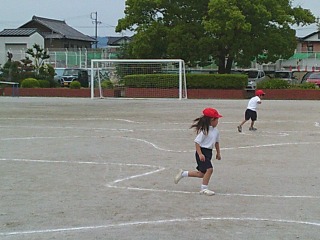 クラスで別れて種目を行っていました。1組は鉄棒。鉄棒の上で写真のような姿勢になる練習をしていました。2組は運動場にひいてある模様の上を走る練習をしていました。曲がるときにはどのような姿勢をとると早く曲がりやすいかを考えていました。