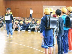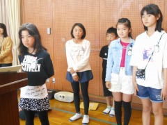 6年生から、校歌の歌詞を書いた巻きものと校歌のプレゼントもありました。