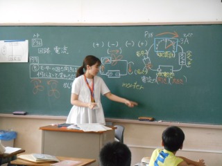 回路について学習していました。電池とモーターのつなぎ方を説明されていました。