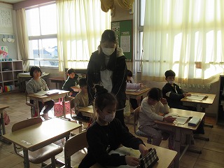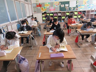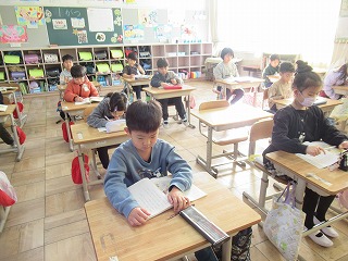 1年2組では、国語の授業が行われていました。登場人物の様子が分かる文に線を引いていました。