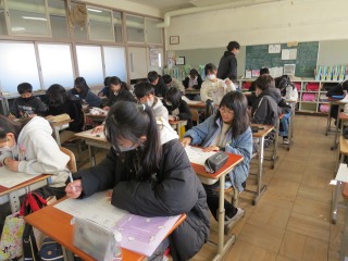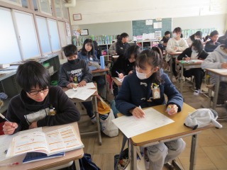 先ほどの3年2組の算数で学習した単位変換を生かし、6年生では面積や体積を単位変換するまとめのプリントに取り組んでいました。しっかりと見直しながら問題を解いていました。