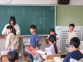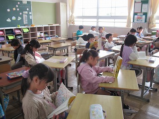 2年1組は国語の時間でした。漢字ドリルが書き終わった児童から、先生に確認してもらい、それが終わった児童は、自分で教科書などを読んでいました。