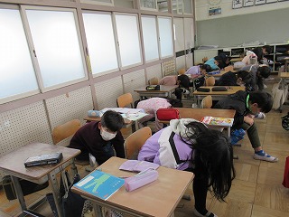 3年2組では、朝のストレッチを行っていました。みんなしっかり体を伸ばしていました。
