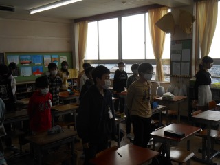 朝の会が始まるところでした。落ち着いて準備をしたうえで、挨拶をしていました。