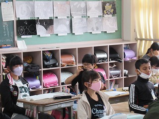 5年1組は学活の時間でした。野外活動で行うすい飯実習の服装について確認していました。着ている服が燃えづらい素材でできているかの確認を行っていました。