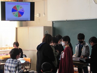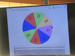 みんなの視線の先には、モニターに映った円グラフ?いや、数字の書かれたル-レットです。これは何をしているか分かりますか?これは、席がえでした。タブレットの活用方法にこんな方法もあるのですね。
