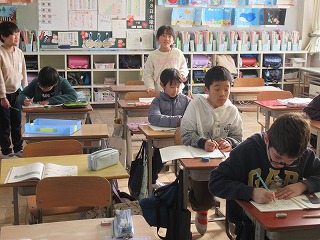 3年1組は算数の時間でした。課題が終わった児童から、担任の先生に確認してもらうために並んでいました。