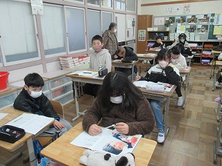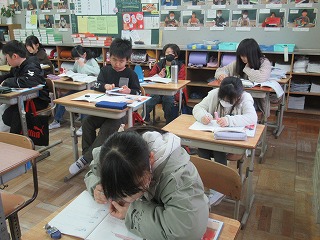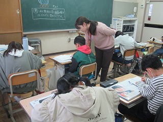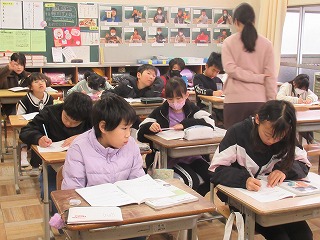 4年2組は、理科の時間でした。水を熱するとどうなるかを考える内容でした。黒板に書かれている図を書き映して、考えを書き込んでいました。