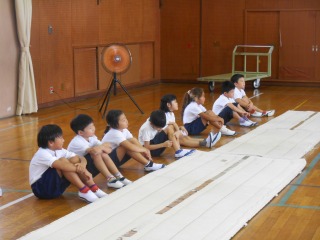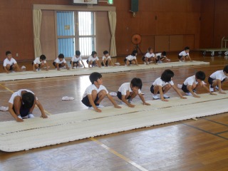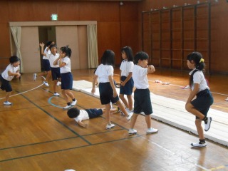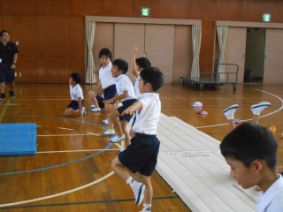 前転の練習をしていました。回った後に両足で立つ練習から、片足で立つことにもチャレンジしていました。何人かの子が成功しました。