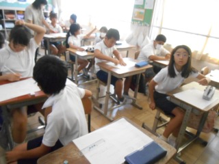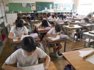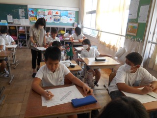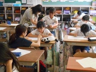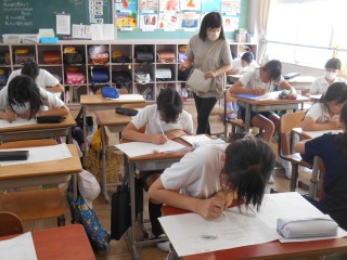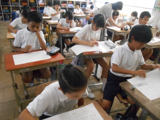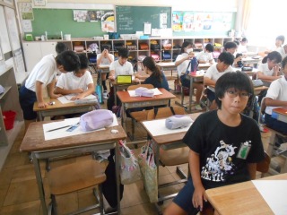 身体測定のため、児童が半分ずつ写っています。かけ算のひっ算を復習していました。