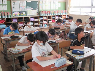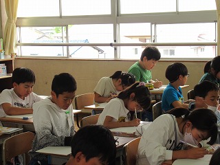 4年1組は算数の時間でした。大きい数の筆算の問題で、自分で解くか、先生と一緒に解くかとたずねられた児童の多くは、「自分で解く!」と答えていました。頼もしい限りです。正解までたどり着けたかな?
