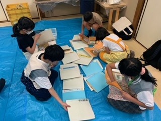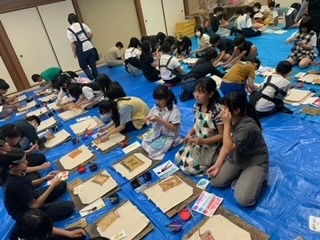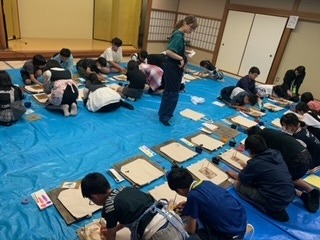 御殿荘で夕食を食べた後は、伝統工芸の友禅染体験を行いました。京都にまつわる絵柄を中心に染め物を行いました。それぞれの個性あふれる作品ができています。