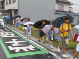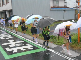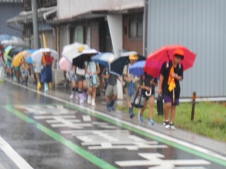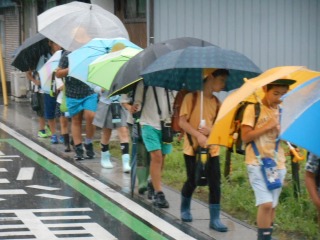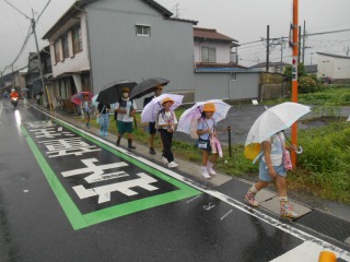 今日は強い雨でした。上級生が班の様子を見ながら、一緒に登校してきてくれました。雨の中見守りも、ありがとうございます。