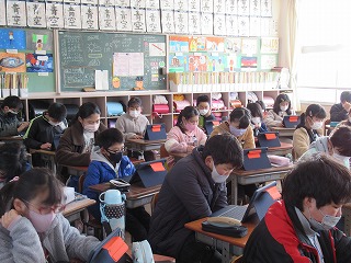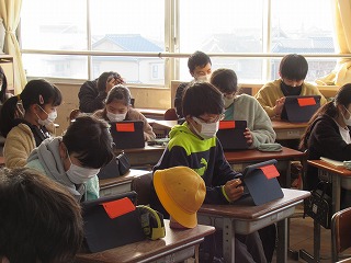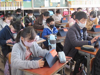 5年2組では、朝の時間、タブレットを使い学習をしていました。黙々と真剣に取り組み姿は立派でした。