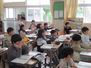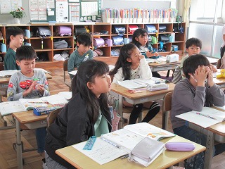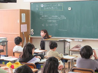3年2組は算数の時間でした。文章から増える数を求める計算式の考え方を発表していました。自分の考えと比較して、理解を深めていきましょう。