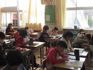 4年2組は国語の時間でした。教科書の内容について、自分の考えをプリントに記入したり、タブレットに入力したりする児童の姿が見られました。