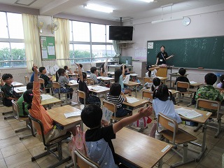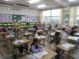 1年2組は国語の時間でした。ひらがなを使ってしりとりをしながら、知っている言葉を発表し合っていました。