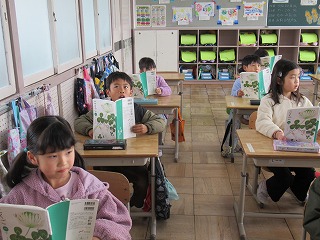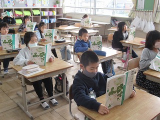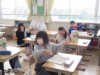 1年1組では、国語の時間、内容の言葉について動作を入れながら確認していました。