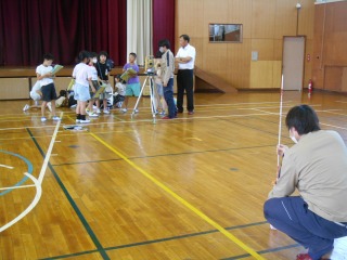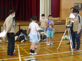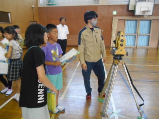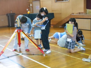 測量器や歩数を使って、距離を測っていました。普段道路で作業されている姿を見ることはありますが、実際にどう距離を測っているのか知ることのできる貴重な授業でした。測量器の仕組みを知り、光を使って距離を測る仕組みを知ることができました。