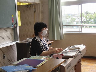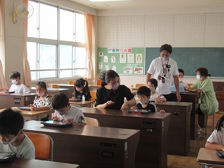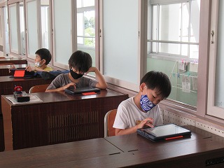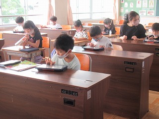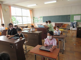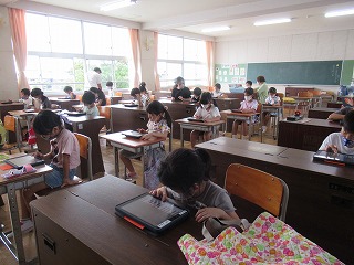 1年1組では、音楽室で音楽の授業が行われていました。タブレットのけん盤を弾いて、曲をつくっていきます。みんな一生懸命、がんばっていました。