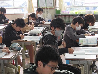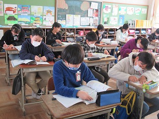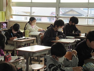 6年1組は理科の時間でした。「てこのはたらき」について、教科書の復習問題に取り組んでいました。みんな真剣に取り組んでいました。