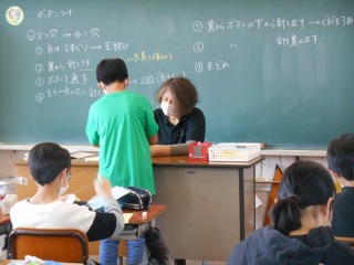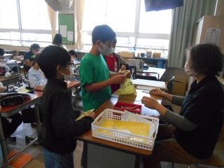 裁縫の学習です。ボタン付けを通して、縫い方や玉どめ、玉むすびを復習していました。
